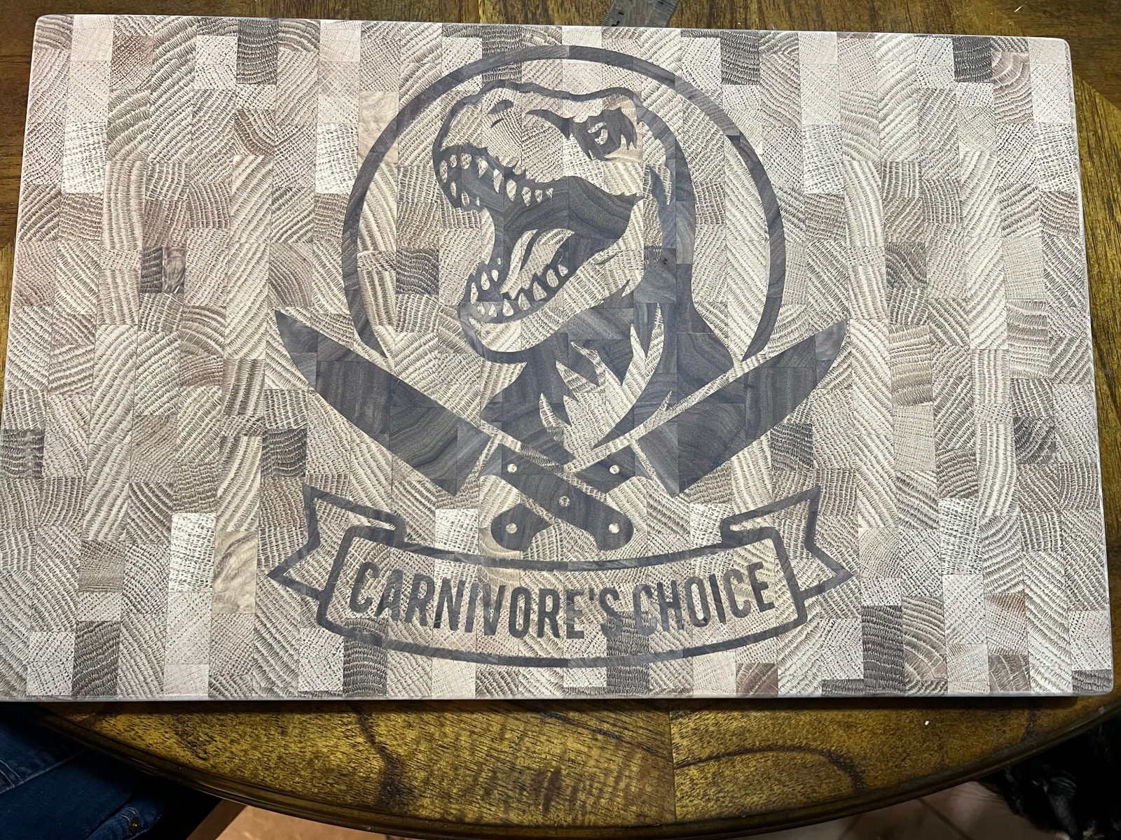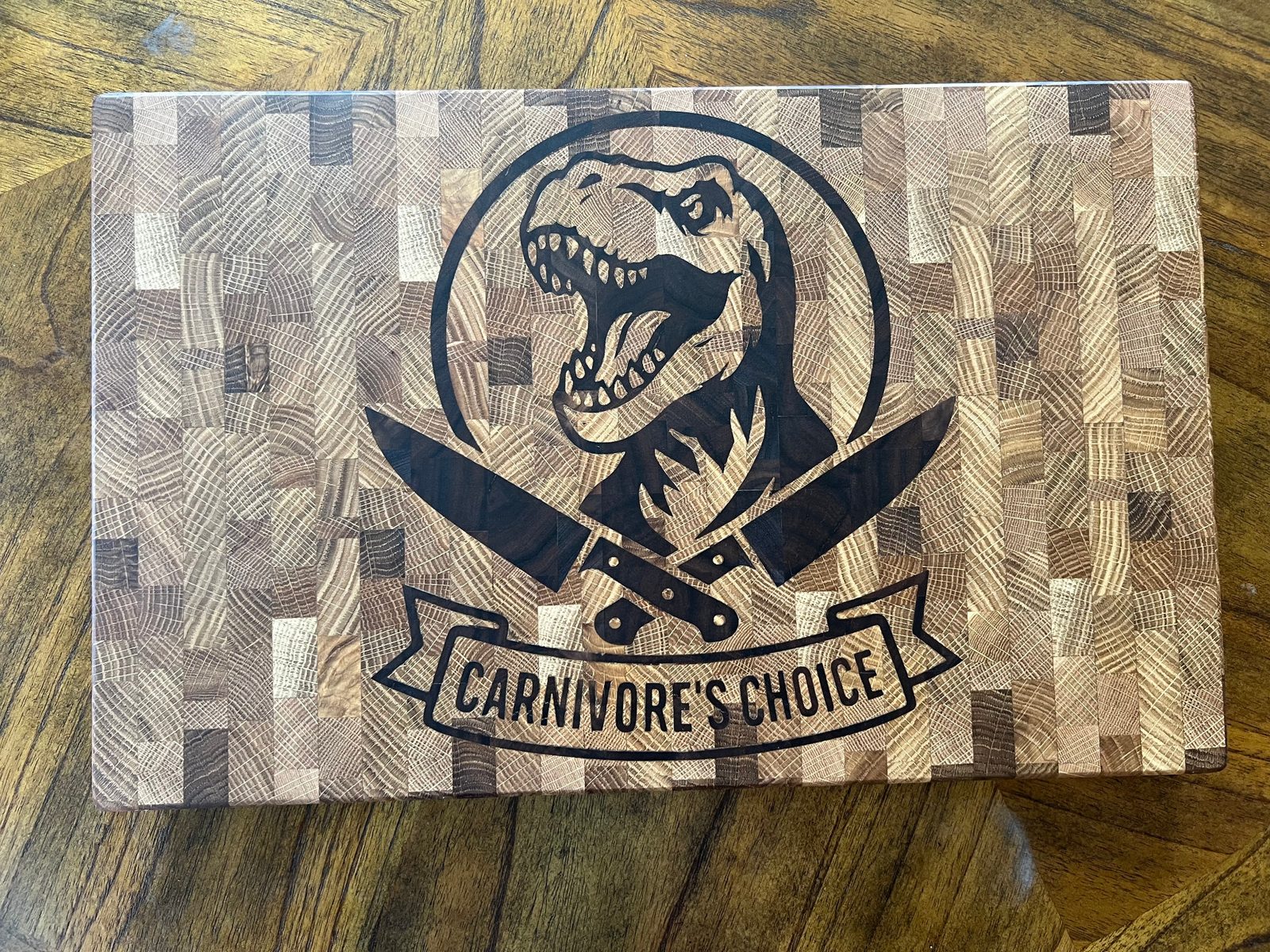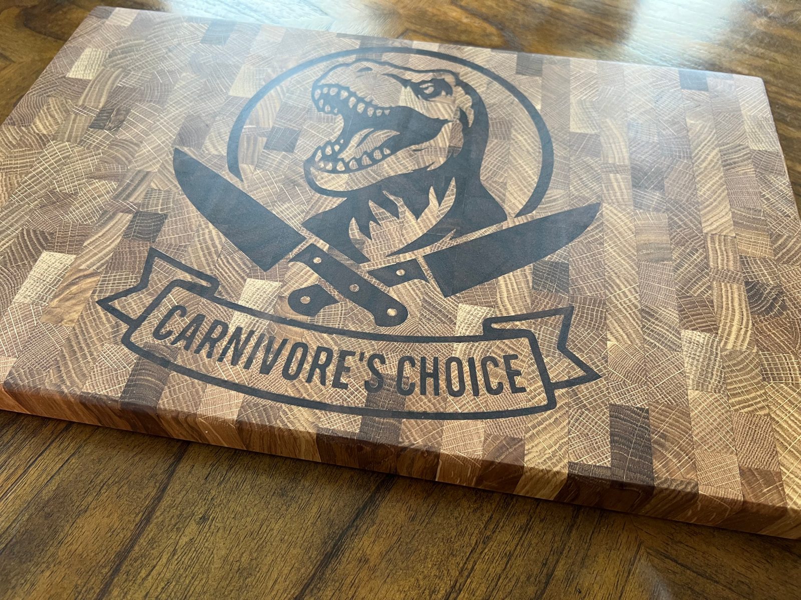 – Original “Carnivore’s Choice” dinosaur graphic inlaid in contrasting hardwood