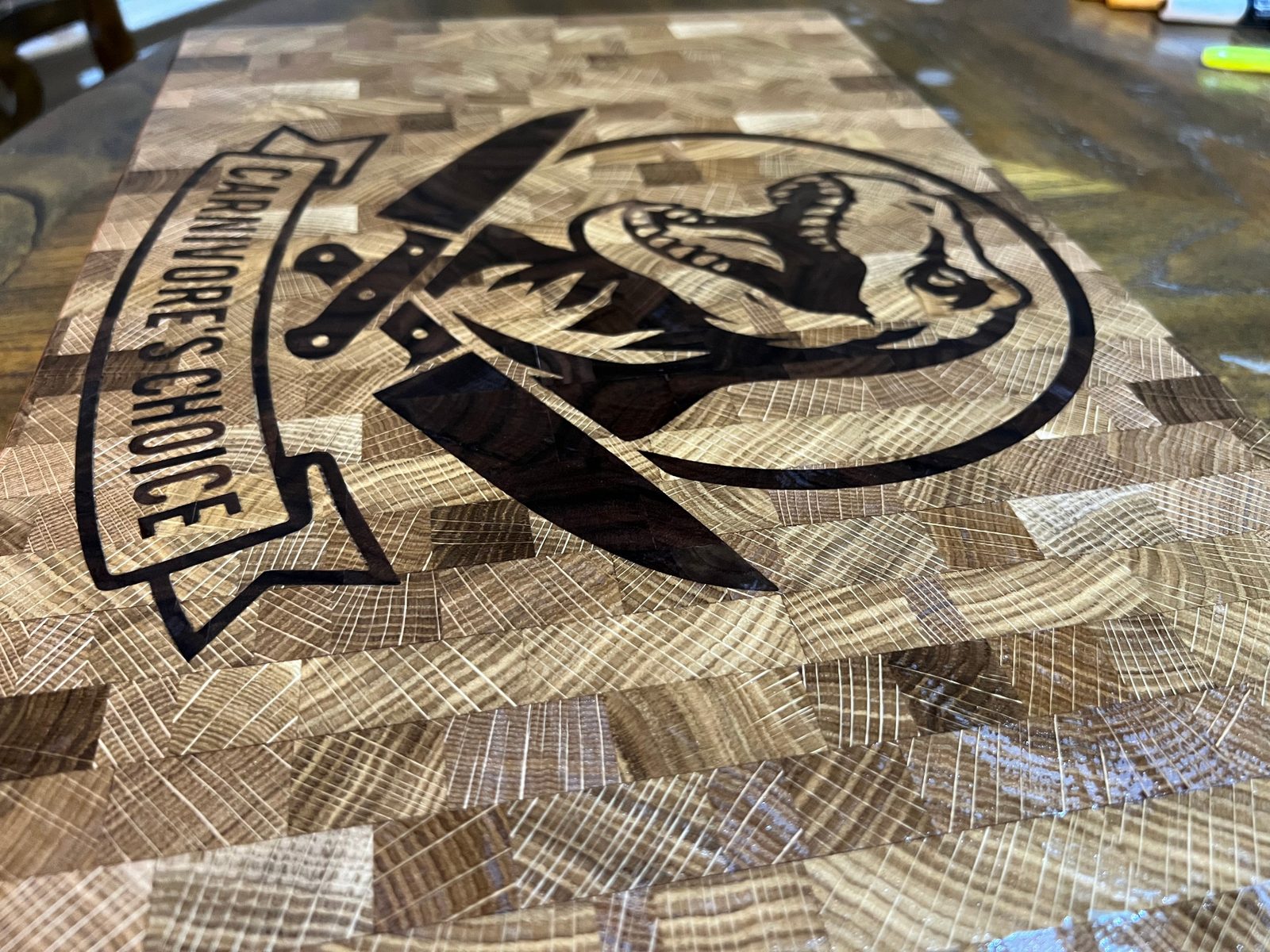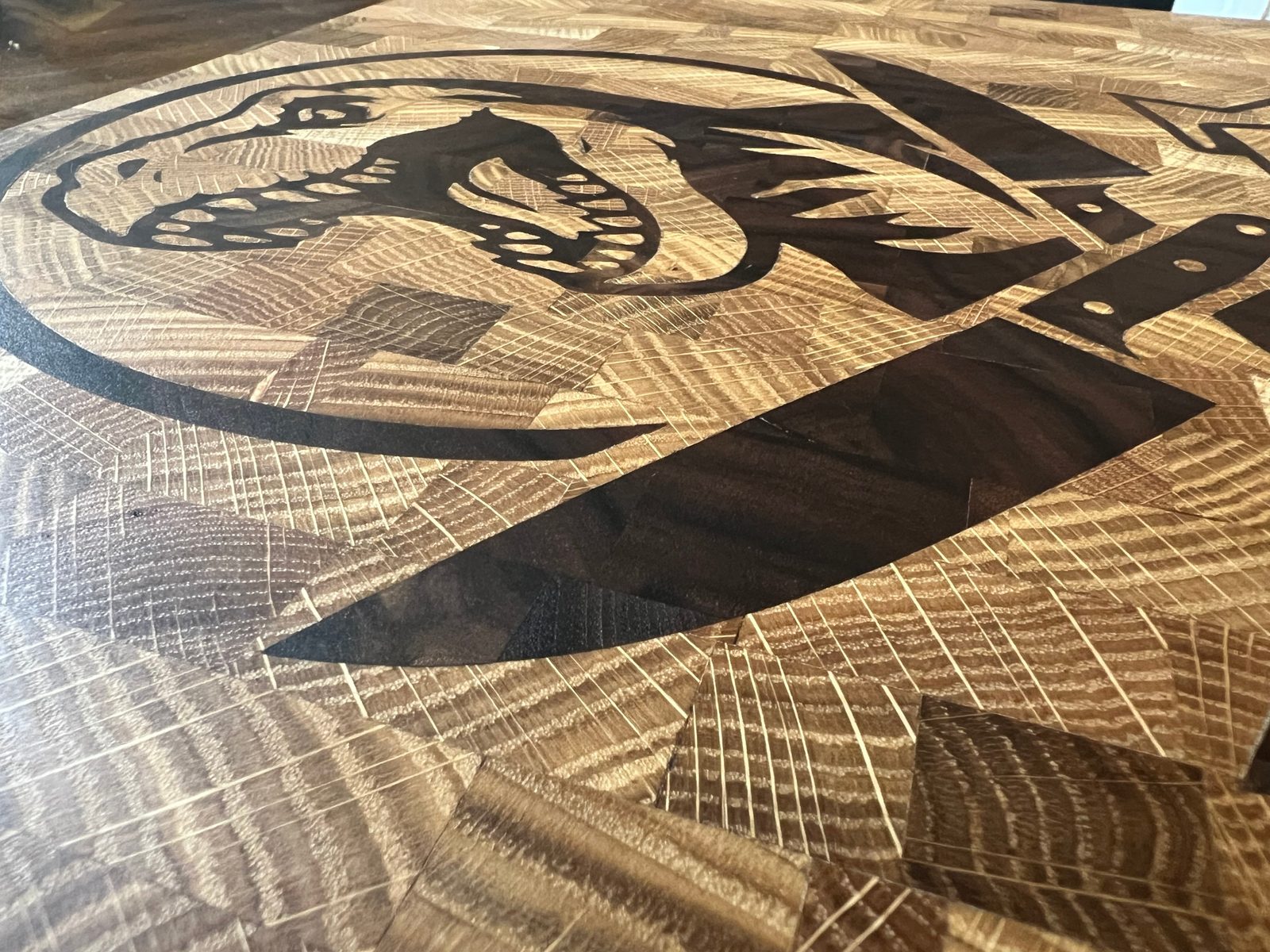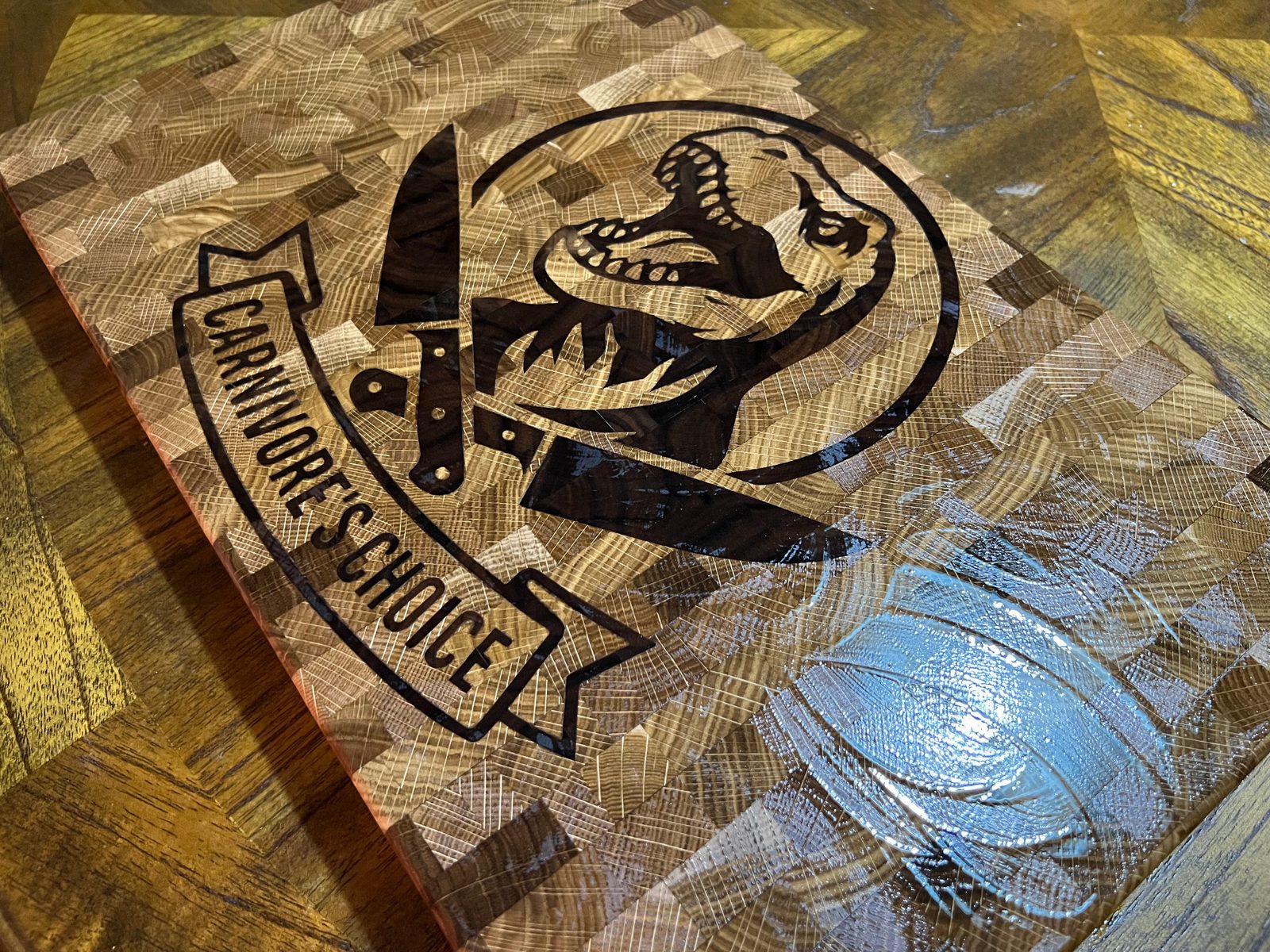 – Original “Carnivore’s Choice” dinosaur graphic inlaid in contrasting hardwood