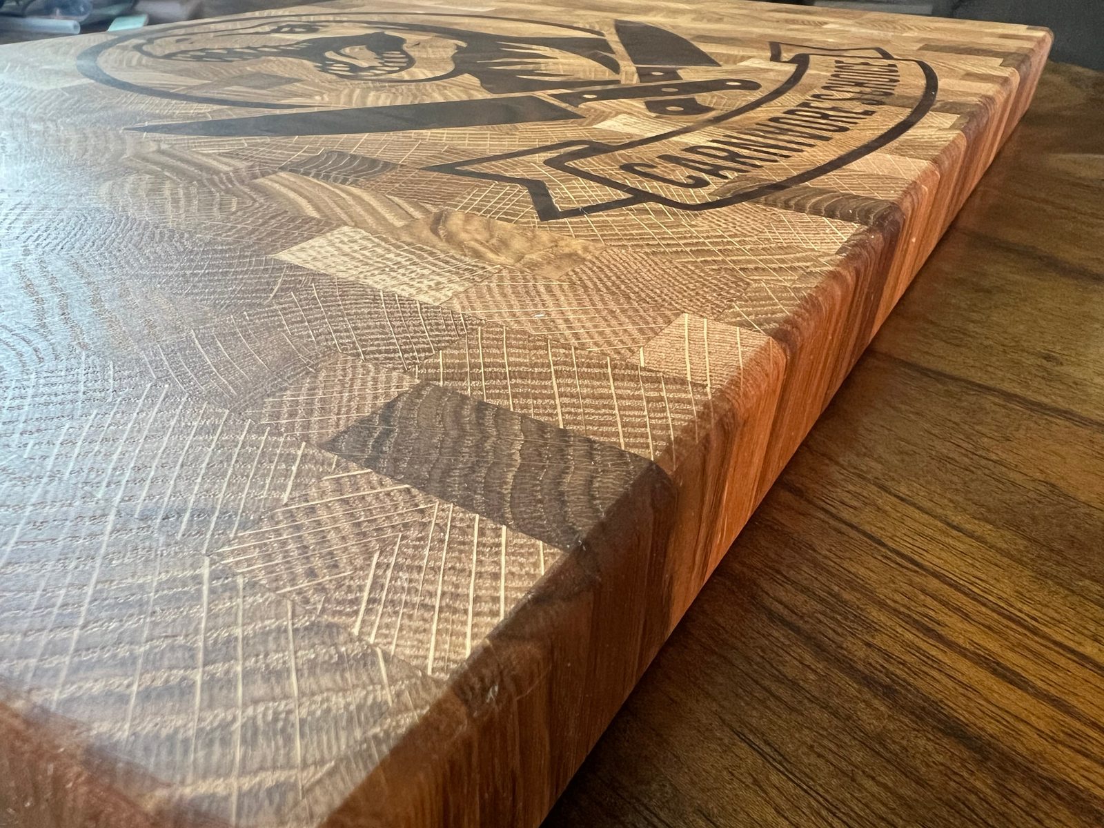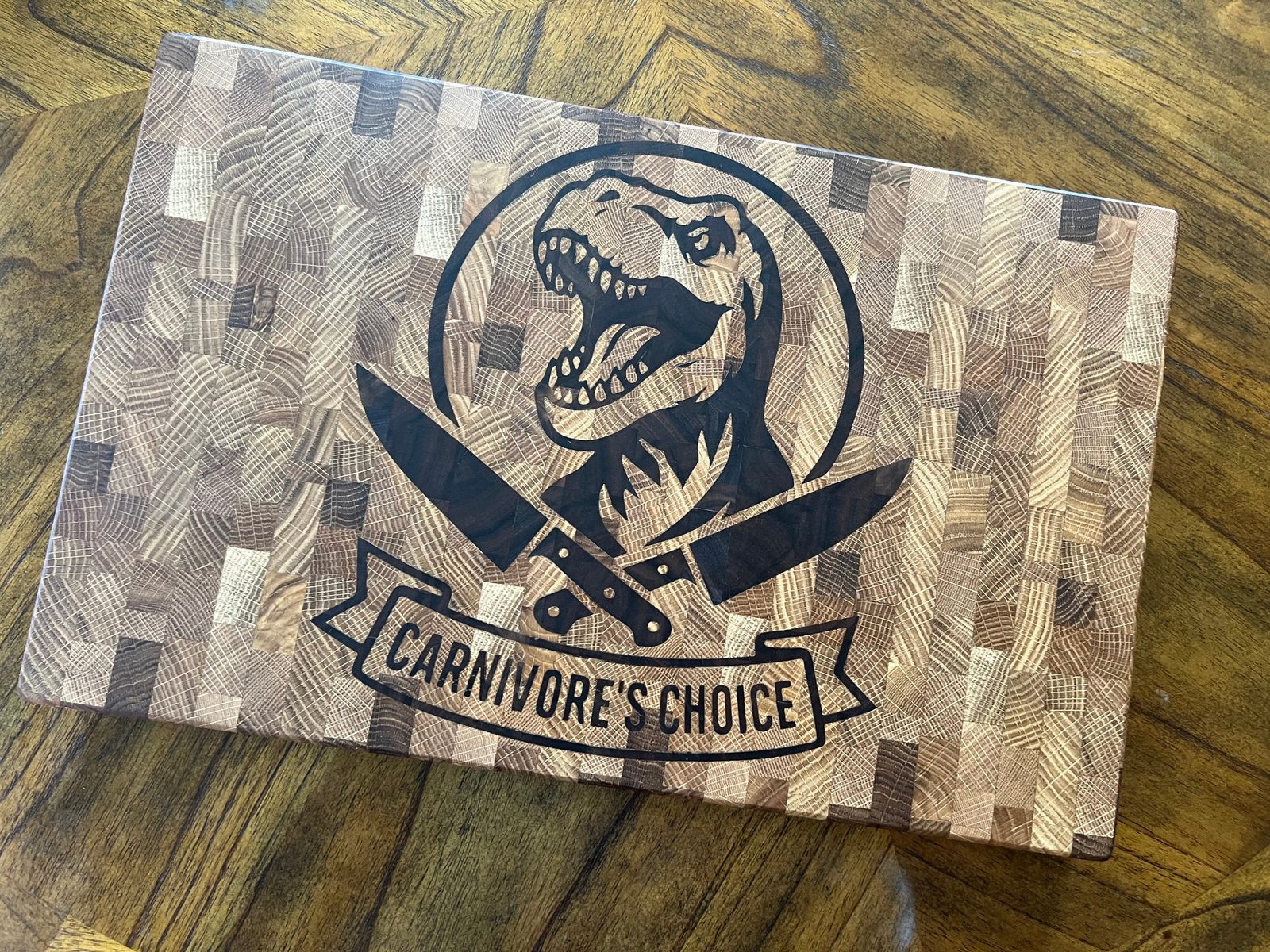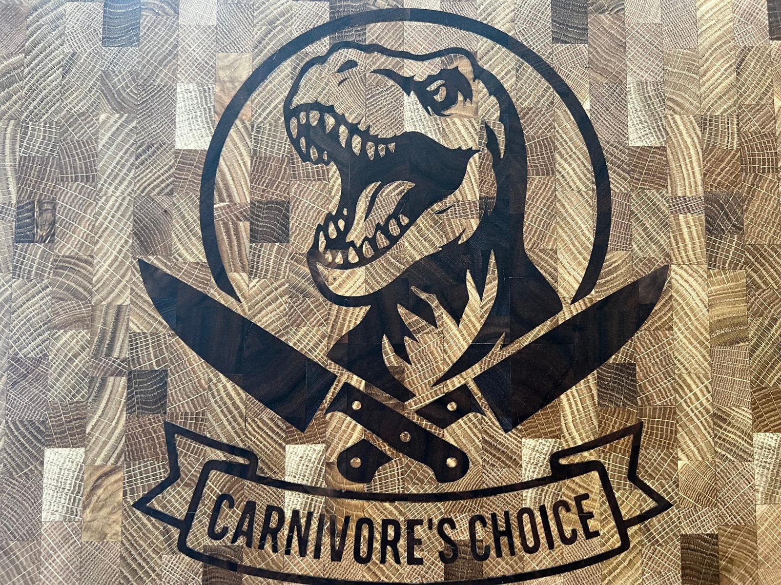 12×19 end grain cutting board with a bold dinosaur and “Carnivore’s Choice” walnut inlay set into white oak. Built like a butcher block for real kitchen work, but striking enough to live on your counter as everyday kitchen art. Handmade one at a time with rubber feet, food-safe finish, and meant to be used for years.
