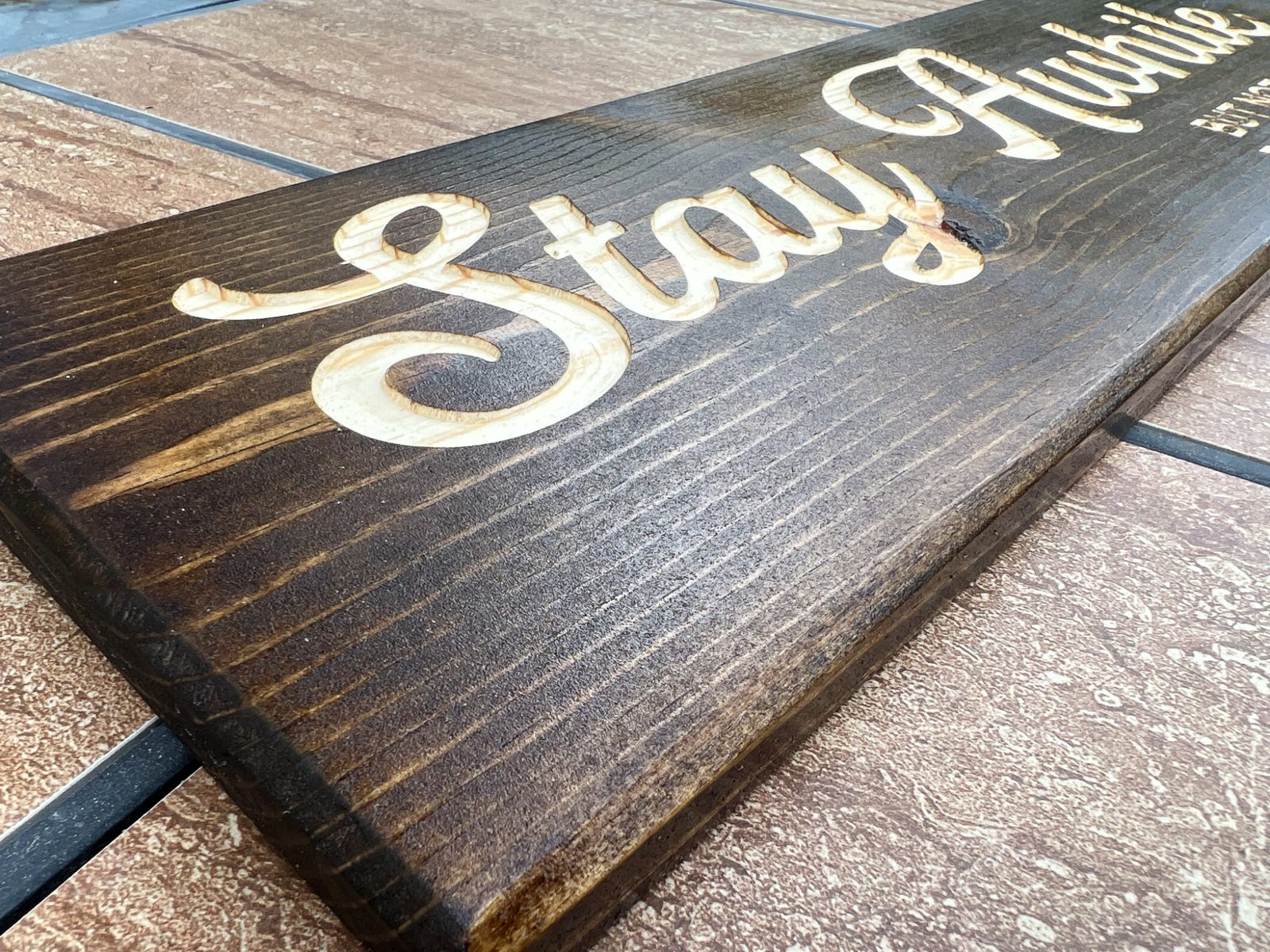 The sign has been sanded smooth and stained prior to carving the letters. The letters are left raw to give a perfect contrast while also still highlighting the natural grain of the wood.